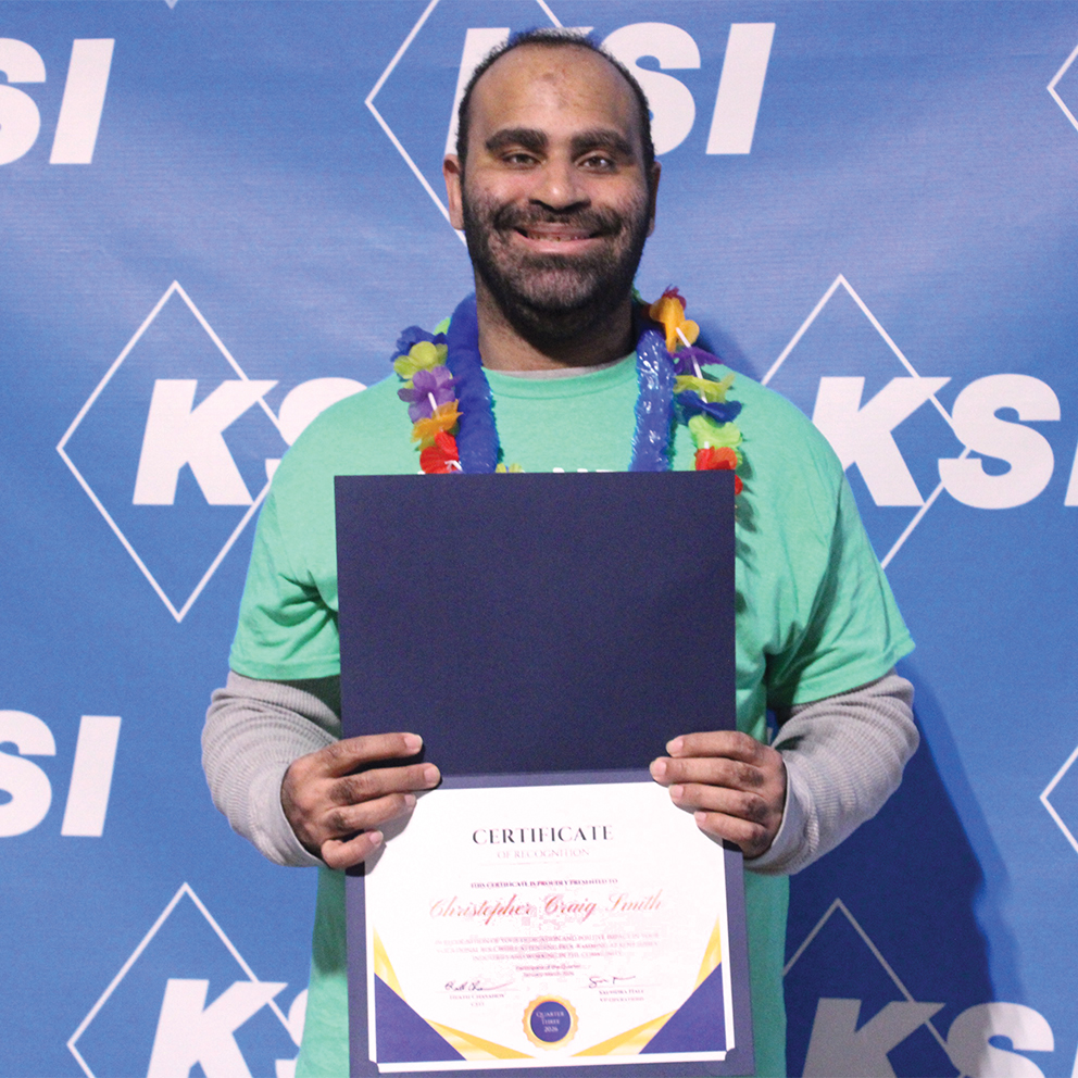KSI recently honored Chris Smith as Participant of the Third Quarter 2026. He was a dedicated member of the Procter & Gamble crew for more than a decade and continually improved in his job during that time. He continued to learn new parts of the multi-pack operations at P&G, including pallet jacking product. Chris was also able to transfer the computer training he gained at KSI’s Milford Skill Development Center on his days off from P&G and learned to scan job tickets into P&G’s tracking system. He’s worked to grow his communication skills, supporting a safe work environment and strengthening his connections across his team. He's the person everyone loves to work with for his kindness and teamwork. His personality is warm and he always has a positive attitude, helping to create a productive consistency in his workplace. Chris is a remarkable individual doing more with his abilities each day to create a better life.