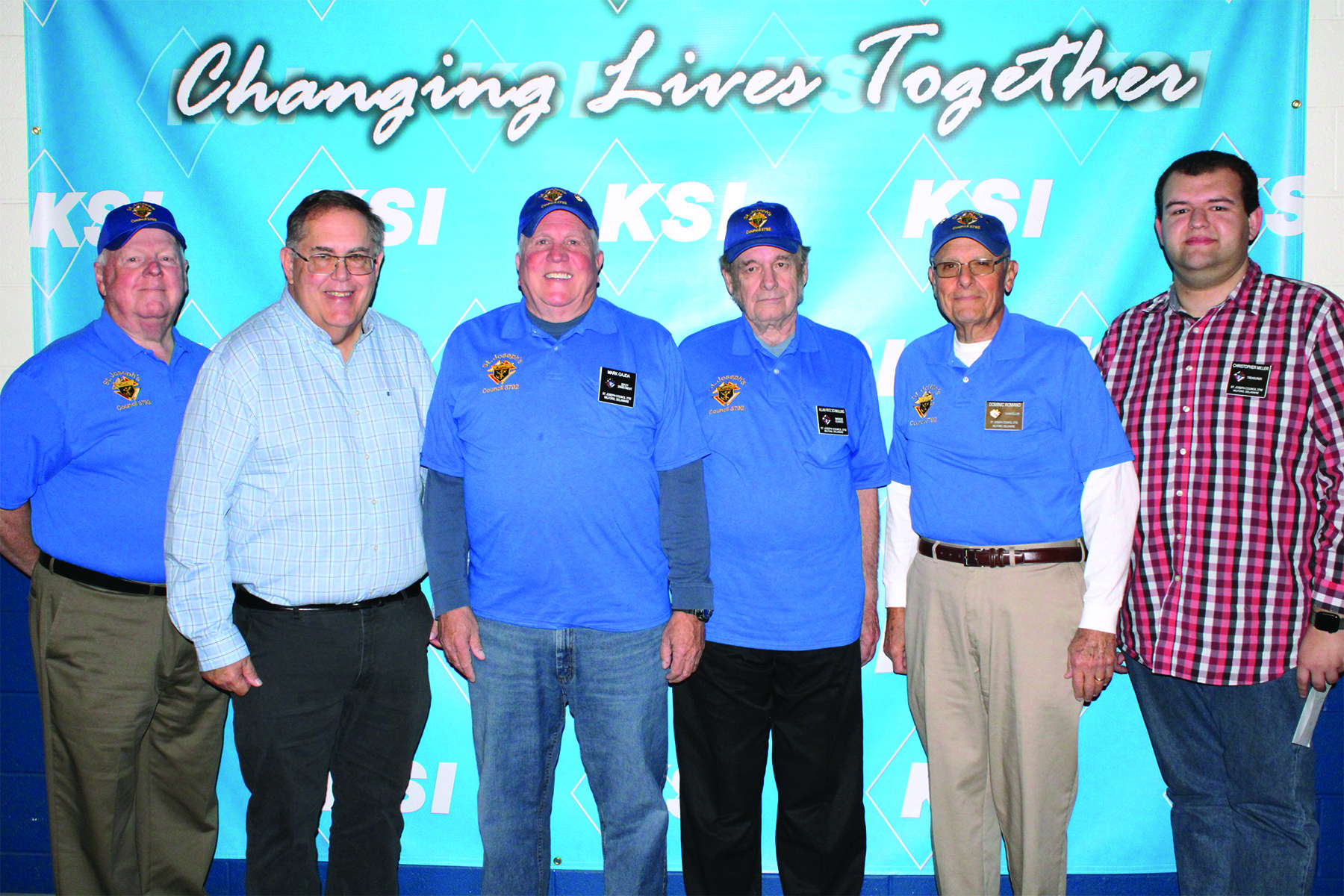 The Knights of Columbus, St. Joseph Council #3792 conducted their annual Tootsie Roll drive, collecting $2,019.75 in donations to support individuals with intellectual or physical disabilities. Shown (left to right) are Knights Tom Farrell, KSI Interim CEO Jim Greenwell, Mark Gajda, Allan Fritz Schmulling, Dominic Romano, and Christopher Miller. Since 2016 the St. Joseph Council #3792 Knights have donated more than $12,000 to KSI.